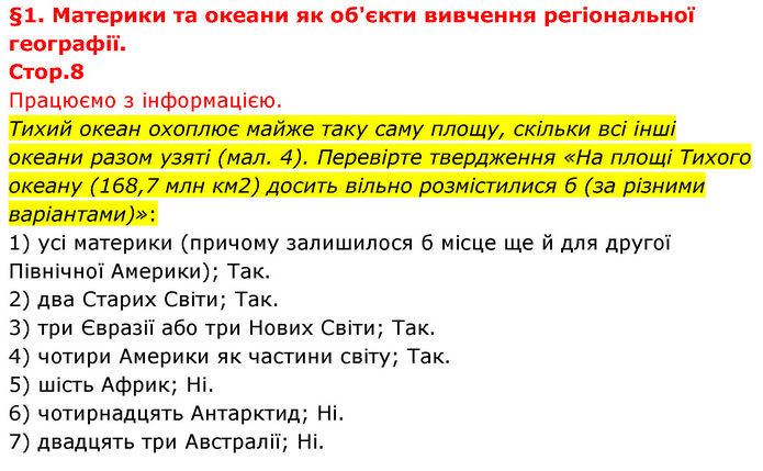 §1. Материки та океани як об'єкти вивчення регіональної географії. Стор.8 Працюємо з інформацією. Тихий океан охоплює майже таку саму площу, скільки всі інші океани разом узяті (мал. 4). Перевірте твердження «На площі Тихого океану (168,7 млн км2) досить вільно розмістилися б (за різними варіантами)»: 1) усі материки (причому залишилося б місце ще й для другої Північної Америки); Так. 2) два Старих Світи; Так. 3) три Євразії або три Нових Світи; Так. 4) чотири Америки як частини світу; Так. 5) шість Африк; Ні. 6) чотирнадцять Антарктид; Ні. 7) двадцять три Австралії; Ні.