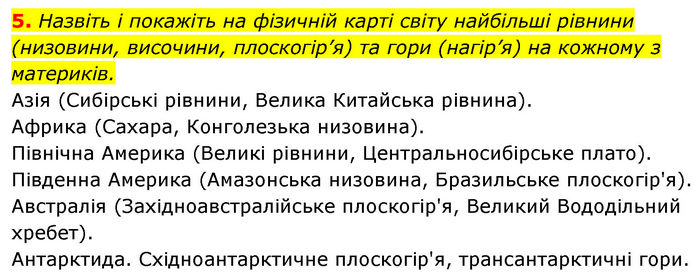 Назвіть і покажіть на фізичній карті світу найбільші рівнини (низовини, височини, плоскогір’я) та гори (нагір’я) на кожному з материків. Азія (Сибірські рівнини, Велика Китайська рівнина). Африка (Сахара, Конголезька низовина). Північна Америка (Великі рівнини, Центральносибірське плато). Південна Америка (Амазонська низовина, Бразильське плоскогір'я). Австралія (Західноавстралійське плоскогір'я, Великий Вододільний хребет). Антарктида. Східноантарктичне плоскогір'я, трансантарктичні гори.