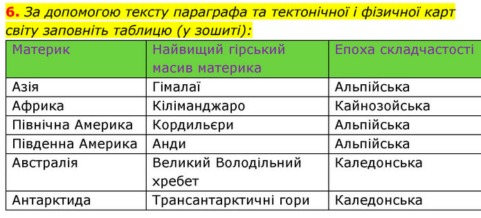 За допомогою тексту параграфа та тектонічної і фізичної карт світу заповніть таблицю (у зошиті): Материк Найвищий гірський масив материка Епоха складчастості Азія Гімалаї Альпійська Африка Кіліманджаро Кайнозойська Північна Америка Кордильєри Альпійська Південна Америка Анди Альпійська Австралія Великий Володільний хребет Каледонська Антарктида Трансантарктичні гори Каледонська