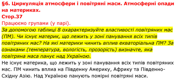 §6. Циркуляція атмосфери і повітряні маси. Атмосферні опади на материках. Стор.37 Працюємо групами (у парі). За допомогою таблиці 8 охарактеризуйте властивості повітряних мас (ПМ). Чи існує материк, що лежить у зоні панування всіх типів повітряних мас? На які материки чинить вплив екваторіальна ПМ? За ознаками (температура, вологість, прозорість) визначте, яка повітряна маса панує над Україною. Не існує материка, що лежить у зоні панування всіх типів повітряних мас. ПМ чинить вплиа на Південну Америку, Африку та Південно-Східну Азію. Над Україною панують помірні повітряні маси.