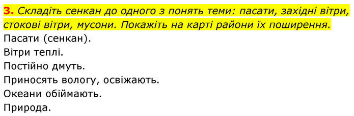 Складіть сенкан до одного з понять теми: пасати, західні вітри, стокові вітри, мусони. Покажіть на карті райони їх поширення. Пасати (сенкан). Вітри теплі. Постійно дмуть. Приносять вологу, освіжають. Океани обіймають. Природа.