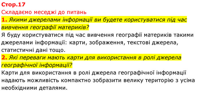 Складаємо меседжі до питань 1. Якими джерелами інформації ви будете користуватися під час вивчення географії материків? Я буду користуватися під час вивчення географії материків такими джерелами інформації: карти, зображення, текстові джерела, статистичні дані тощо. 2. Які переваги мають карти для використання в ролі джерела географічної інформації? Карти для використання в ролі джерела географічної інформації надають можливість компактно зобразити велику територію з усіма необхідними деталями.