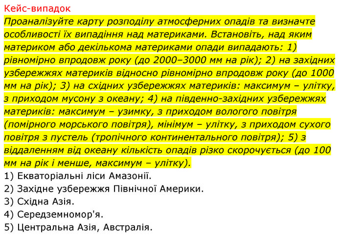 Кейс-випадок Проаналізуйте карту розподілу атмосферних опадів та визначте особливості їх випадіння над материками. Встановіть, над яким материком або декількома материками опади випадають: 1) рівномірно впродовж року (до 2000–3000 мм на рік); 2) на західних узбережжях материків відносно рівномірно впродовж року (до 1000 мм на рік); 3) на східних узбережжях материків: максимум – улітку, з приходом мусону з океану; 4) на південно-західних узбережжях материків: максимум – узимку, з приходом вологого повітря (помірного морського повітря), мінімум – улітку, з приходом сухого повітря з пустель (тропічного континентального повітря); 5) з віддаленням від океану кількість опадів різко скорочується (до 100 мм на рік і менше, максимум – улітку). 1) Екваторіальні ліси Амазонії. 2) Західне узбережжя Північної Америки. 3) Східна Азія. 4) Середземномор'я. 5) Центральна Азія, Австралія.