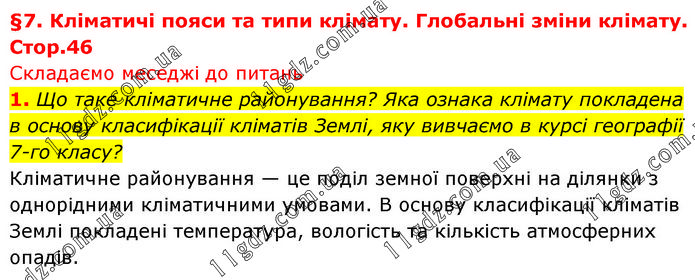 §7. Кліматичі пояси та типи клімату. Глобальні зміни клімату. Стор.46 Складаємо меседжі до питань 1. Що таке кліматичне районування? Яка ознака клімату покладена в основу класифікації кліматів Землі, яку вивчаємо в курсі географії 7-го класу? Кліматичне районування — це поділ земної поверхні на ділянки з однорідними кліматичними умовами. В основу класифікації кліматів Землі покладені температура, вологість та кількість атмосферних опадів.