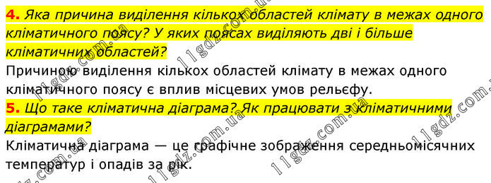 4. Яка причина виділення кількох областей клімату в межах одного кліматичного поясу? У яких поясах виділяють дві і більше кліматичних областей? Причиною виділення кількох областей клімату в межах одного кліматичного поясу є вплив місцевих умов рельєфу. 5. Що таке кліматична діаграма? Як працювати з кліматичними діаграмами? Кліматична діаграма — це графічне зображення середньомісячних температур і опадів за рік.