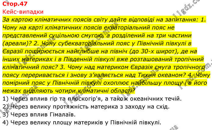 Кейс-випадки За картою кліматичних поясів світу дайте відповіді на запитання: 1. Чому на карті кліматичних поясів екваторіальний пояс не представлений суцільною смугою, а розділений на три частини (ареали)? 2. Чому субекваторіальний пояс у Північній півкулі в Євразії поширюється найглибше на північ (до 30-х широт), де на інших материках і в Південній півкулі вже розташований тропічний кліматичний пояс? 3. Чому над материком Євразія смуга тропічного поясу переривається і знову з’являється над Тихим океаном? 4. Чому помірний пояс у Північній півкулі охоплює найбільшу площу і в його межах виділяють чотири кліматичні області? 1) Через вплив гір та плоскогір'я, а також океанічних течій. 2) Через велику протяжність материка з заходу на схід. 3) Через вплив Гімалаїв. 4) Через велику площу материків у Північній півкулі.