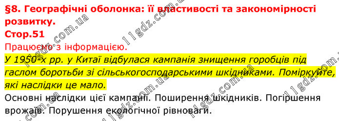 §8. Географічні оболонка: її властивості та закономірності розвитку. Стор.51 Працюємо з інформацією. У 1950-х рр. у Китаї відбулася кампанія знищення горобців під гаслом боротьби зі сільськогосподарськими шкідниками. Поміркуйте, які наслідки це мало. Основні наслідки цієї кампанії. Поширення шкідників. Погіршення врожаїв. Порушення екологічної рівноваги.