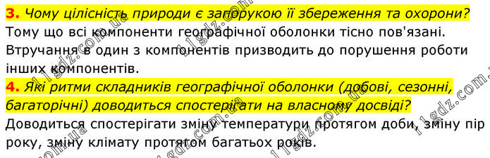 3. Чому цілісність природи є запорукою її збереження та охорони? Тому що всі компоненти географічної оболонки тісно пов'язані. Втручання в один з компонентів призводить до порушення роботи інших компонентів. 4. Які ритми складників географічної оболонки (добові, сезонні, багаторічні) доводиться спостерігати на власному досвіді? Доводиться спостерігати зміну температури протягом доби, зміну пір року, зміну клімату протягом багатьох років.
