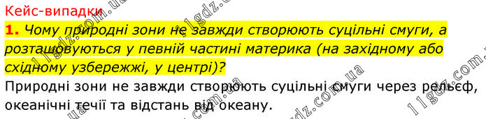Кейс-випадки 1. Чому природні зони не завжди створюють суцільні смуги, а розташовуються у певній частині материка (на західному або східному узбережжі, у центрі)? Природні зони не завжди створюють суцільні смуги через рельєф, океанічні течії та відстань від океану.