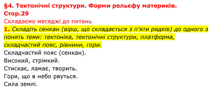 §4. Тектонічні структури. Форми рельєфу материків. Стор.29 Складаємо меседжі до питань 1. Складіть сенкан (вірш, що складається з п’яти рядків) до одного з понять теми: тектоніка, тектонічні структури, платформа, складчастий пояс, рівнини, гори. Складчастий пояс (сенкан). Високий, стрімкий. Стискає, ламає, творить. Гори, що в небо рвуться. Сила землі.