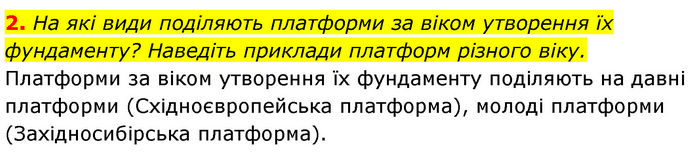 На які види поділяють платформи за віком утворення їх фундаменту? Наведіть приклади платформ різного віку. Платформи за віком утворення їх фундаменту поділяють на давні платформи (Східноєвропейська платформа), молоді платформи (Західносибірська платформа).