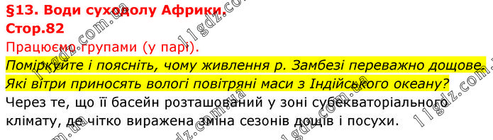 §13. Води суходолу Африки. Стор.82 Працюємо групами (у парі). Поміркуйте і поясніть, чому живлення р. Замбезі переважно дощове. Які вітри приносять вологі повітряні маси з Індійського океану? Через те, що її басейн розташований у зоні субекваторіального клімату, де чітко виражена зміна сезонів дощів і посухи.
