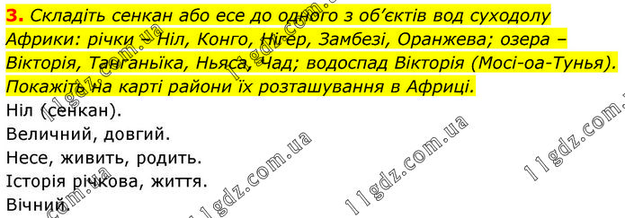 Складіть сенкан або есе до одного з об’єктів вод суходолу Африки: річки – Ніл, Конго, Нігер, Замбезі, Оранжева; озера – Вікторія, Танганьїка, Ньяса, Чад; водоспад Вікторія (Мосі-оа-Тунья). Покажіть на карті райони їх розташування в Африці. Ніл (сенкан). Величний, довгий. Несе, живить, родить. Історія річкова, життя. Вічний.