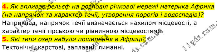 4. Як впливає рельєф на розподіл річкової мережі материка Африка (на напрямок та характер течії, утворення порогів і водоспадів)? Наприклад, напрямок течії визначається нахилом місцевості, а характер течії гірською чи рівнинною місцевостями. 5. Які типи озер набули поширення в Африці? Тектонічні, карстові, заплавні, лиманні.