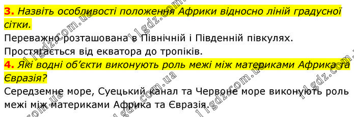 3. Назвіть особливості положення Африки відносно ліній градусної сітки. Переважно розташована в Північній і Південній півкулях. Простягається від екватора до тропіків. 4. Які водні об’єкти виконують роль межі між материками Африка та Євразія? Середземне море, Суецький канал та Червоне море виконують роль межі між материками Африка та Євразія.