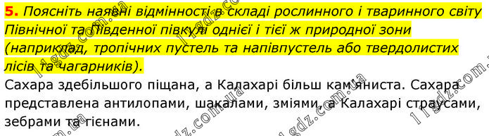 Поясніть наявні відмінності в складі рослинного і тваринного світу Північної та Південної півкулі однієї і тієї ж природної зони (наприклад, тропічних пустель та напівпустель або твердолистих лісів та чагарників). Сахара здебільшого піщана, а Калахарі більш кам'яниста. Сахара представлена антилопами, шакалами, зміями, а Калахарі страусами, зебрами та гієнами.