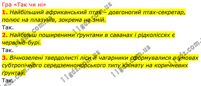 Гра «Так чи ні» 1. Найбільший африканський птах – довгоногий птах-секретар, полює на плазунів, зокрема на змій. Так. 2. Найбільш поширеними ґрунтами в саванах і рідколіссях є червоно-бурі. Так. 3. Вічнозелені твердолисті ліси й чагарники сформувалися в умовах субтропічного середземноморського типу клімату на коричневих ґрунтах. Так.