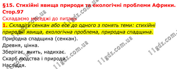 §15. Стихійні явища природи та екологічні проблеми Африки. Стор.97 Складаємо меседжі до питань 1. Складіть сенкан або есе до одного з понять теми: стихійні природні явища, екологічна проблема, природна спадщина. Природна спадщина (сенкан). Древня, цінна. Зберігає, вчить, надихає. Скарб людства і природи. Насліддя.