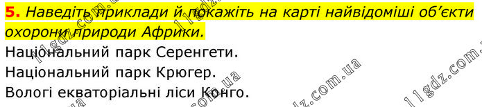 Наведіть приклади й покажіть на карті найвідоміші об’єкти охорони природи Африки. Національний парк Серенгети. Національний парк Крюгер. Вологі екваторіальні ліси Конго.