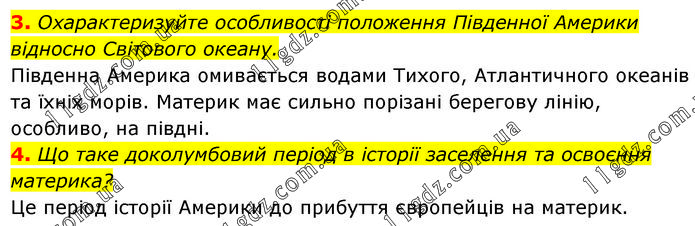 3. Охарактеризуйте особливості положення Південної Америки відносно Світового океану. Південна Америка омивається водами Тихого, Атлантичного океанів та їхніх морів. Материк має сильно порізані берегову лінію, особливо, на півдні. 4. Що таке доколумбовий період в історії заселення та освоєння материка? Це період історії Америки до прибуття європейців на материк.