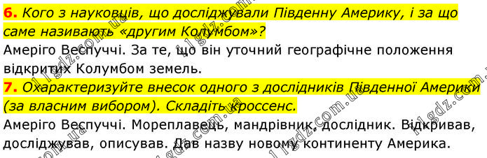 6. Кого з науковців, що досліджували Південну Америку, і за що саме називають «другим Колумбом»? Амеріго Веспуччі. За те, що він уточний географічне положення відкритих Колумбом земель. 7. Охарактеризуйте внесок одного з дослідників Південної Америки (за власним вибором). Складіть кроссенс. Амеріго Веспуччі. Мореплавець, мандрівник, дослідник. Відкривав, досліджував, описував. Дав назву новому континенту Америка.