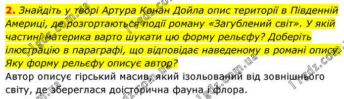 Знайдіть у творі Артура Конан Дойла опис території в Південній Америці, де розгортаються події роману «Загублений світ». У якій частині материка варто шукати цю форму рельєфу? Доберіть ілюстрацію в параграфі, що відповідає наведеному в романі опису. Яку форму рельєфу описує автор? Автор описує гірський масив, який ізольований від зовнішнього світу, де збереглася доісторична фауна і флора.