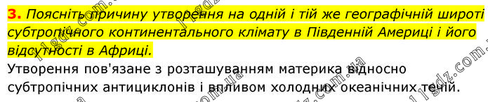 Поясніть причину утворення на одній і тій же географічній широті субтропічного континентального клімату в Південній Америці і його відсутності в Африці. Утворення пов'язане з розташуванням материка відносно субтропічних антициклонів і впливом холодних океанічних течій.