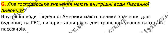 6. Яке господарське значення мають внутрішні води Південної Америки? Внутрішні води Південної Америки мають велике значення для будівництва ГЕС, використання річок для транспортування вантажів і пасажирів.