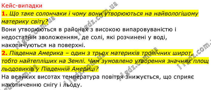 Кейс-випадки 1. Що таке солончаки і чому вони утворюються на найвологішому материку світу? Вони утворюються в районах з високою випаровуваністю і недостатнім зволоженням, де солі, які розчинені у воді, накопичуються на поверхні. 2. Південна Америка – один з трьох материків тропічних широт, тобто найтепліших на Землі. Чим зумовлено утворення значних площ льодовиків у Південній Америці? На великих висотах температура повітря знижується, що сприяє накопиченню снігу і льоду.