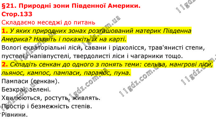 §21. Природні зони Південної Америки. Стор.133 Складаємо меседжі до питань 1. У яких природних зонах розташований материк Південна Америка? Назвіть і покажіть їх на карті. Вологі екваторіальні ліси, савани і рідколісся, трав'янисті степи, пустелі і напівпустелі, твердолисті ліси і чагарники тощо. 2. Складіть сенкан до одного з понять теми: сельва, мангрові ліси, льянос, кампос, пампаси, парамос, пуна. Пампаси (сенкан). Безкраї, зелені. Хвилюються, ростуть, живлять. Простір і безмежність степів. Рівнини.
