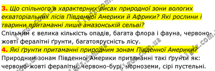 3. Що спільного в характерних рисах природної зони вологих екваторіальних лісів Південної Америки й Африки? Які рослини і тварини притаманні лише амазонській сельві? Спільним є велика кількість опадів, багата флора і фауна, червоно-жовті фералітні ґрунти, багатоярусність лісу. 4. Які ґрунти притаманні природним зонам Південної Америки? Природним зонам Південної Америки притаманні такі ґрунти як: червоно-жовті фералітні, червоно-бурі, чорноземи, сірі пустельні.