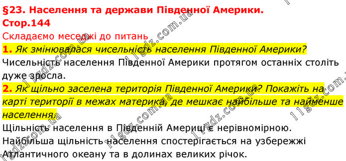 §23. Населення та держави Південної Америки. Стор.144 Складаємо меседжі до питань 1. Як змінювалася чисельність населення Південної Америки? Чисельність населення Південної Америки протягом останніх століть дуже зросла. 2. Як щільно заселена територія Південної Америки? Покажіть на карті території в межах материка, де мешкає найбільше та найменше населення. Щільність населення в Південній Америці є нерівномірною. Найбільша щільність населення спостерігається на узбережжі Атлантичного океану та в долинах великих річок.