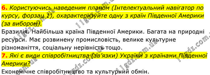 6. Користуючись наведеним планом (Інтелектуальний навігатор по курсу, форзац 1), охарактеризуйте одну з країн Південної Америки (за вибором). Бразилія. Найбільша країна Південної Америки. Багата на природні ресурси. Має розвинену промисловість, велике культурне різноманіття, соціальну нерівність тощо. 7. Які є види співробітництва (зв’язки) України з країнами Південної Америки? Економічне співробітництво та культурний обмін.