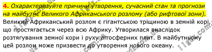 Охарактеризуйте причини утворення, сучасний стан та прогнози на майбутнє Великого Африканського розлому (або рифтової зони). Великий Африканський розлом є гігантською тріщиною в земній корі, що простягається через всю Африку. Утворилася внаслідок розтягування земної кори і руху літосферних плит. В майбутньому цей розлом може призвести до утворення нового океану.