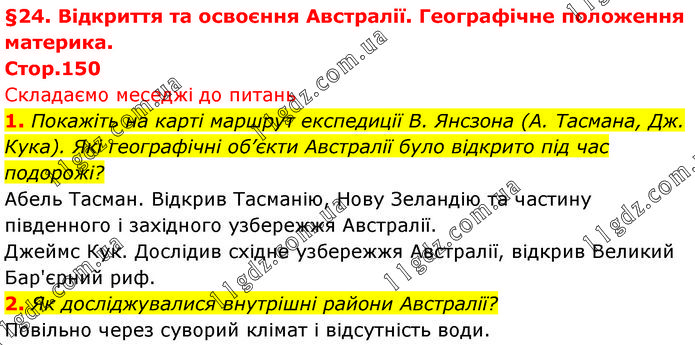§24. Відкриття та освоєння Австралії. Географічне положення материка. Стор.150 Складаємо меседжі до питань 1. Покажіть на карті маршрут експедиції В. Янсзона (А. Тасмана, Дж. Кука). Які географічні об’єкти Австралії було відкрито під час подорожі? Абель Тасман. Відкрив Тасманію, Нову Зеландію та частину південного і західного узбережжя Австралії. Джеймс Кук. Дослідив східне узбережжя Австралії, відкрив Великий Бар'єрний риф. 2. Як досліджувалися внутрішні райони Австралії? Повільно через суворий клімат і відсутність води.