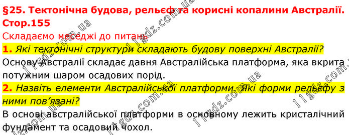 §25. Тектонічна будова, рельєф та корисні копалини Австралії. Стор.155 Складаємо меседжі до питань 1. Які тектонічні структури складають будову поверхні Австралії? Основу Австралії складає давня Австралійська платформа, яка вкрита потужним шаром осадових порід. 2. Назвіть елементи Австралійської платформи. Які форми рельєфу з ними пов’язані? В основі австралійської платформи в основному лежить кристалічний фундамент та осадовий чохол.