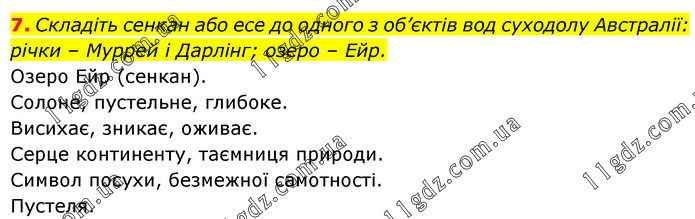 7. Складіть сенкан або есе до одного з об’єктів вод суходолу Австралії: річки – Муррей і Дарлінг; озеро – Ейр. Озеро Ейр (сенкан). Солоне, пустельне, глибоке. Висихає, зникає, оживає. Серце континенту, таємниця природи. Символ посухи, безмежної самотності. Пустеля.
