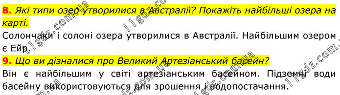 8. Які типи озер утворилися в Австралії? Покажіть найбільші озера на карті. Солончаки і солоні озера утворилися в Австралії. Найбільшим озером є Ейр. 9. Що ви дізналися про Великий Артезіанський басейн? Він є найбільшим у світі артезіанським басейном. Підземні води басейну використовуються для зрошення і водопостачання.