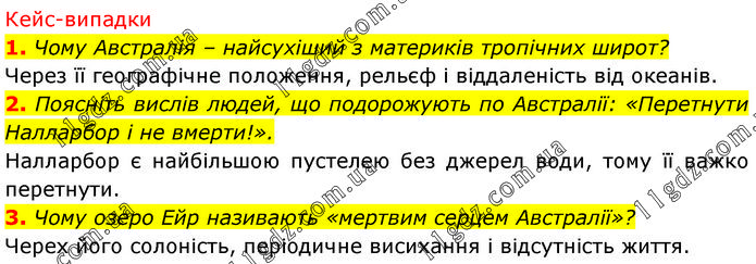Кейс-випадки 1. Чому Австралія – найсухіший з материків тропічних широт? Через її географічне положення, рельєф і віддаленість від океанів. 2. Поясніть вислів людей, що подорожують по Австралії: «Перетнути Налларбор і не вмерти!». Налларбор є найбільшою пустелею без джерел води, тому її важко перетнути. 3. Чому озеро Ейр називають «мертвим серцем Австралії»? Черех його солоність, періодичне висихання і відсутність життя.