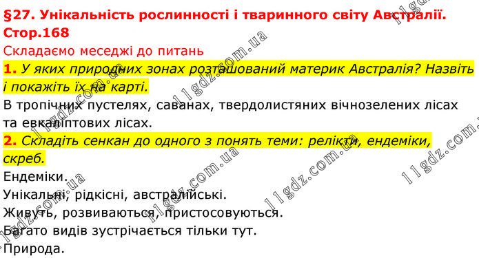 §27. Унікальність рослинності і тваринного світу Австралії. Стор.168 Складаємо меседжі до питань 1. У яких природних зонах розташований материк Австралія? Назвіть і покажіть їх на карті. В тропічних пустелях, саванах, твердолистяних вічнозелених лісах та евкаліптових лісах. 2. Складіть сенкан до одного з понять теми: релікти, ендеміки, скреб. Ендеміки. Унікальні, рідкісні, австралійські. Живуть, розвиваються, пристосовуються. Багато видів зустрічається тільки тут. Природа.