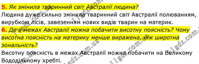 5. Як змінила тваринний світ Австралії людина? Людина дуже сильно змінила тваринний світ Австралії полюванням, вирубкою лісів, завезенням нових видів тварин на материк. 6. Де в межах Австралії можна побачити висотну поясність? Чому висотна поясність на материку менше виражена, ніж широтна зональність? Висотну поясність в межах Австралії можна побачити на Великому Вододільному хребті.