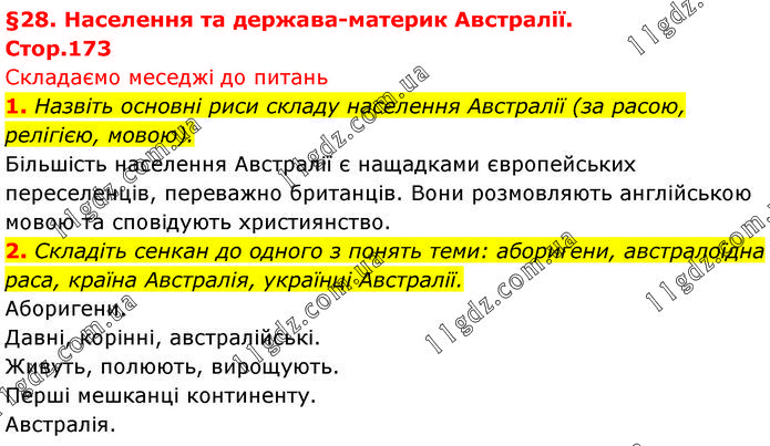 §28. Населення та держава-материк Австралії. Стор.173 Складаємо меседжі до питань 1. Назвіть основні риси складу населення Австралії (за расою, релігією, мовою). Більшість населення Австралії є нащадками європейських переселенців, переважно британців. Вони розмовляють англійською мовою та сповідують християнство. 2. Складіть сенкан до одного з понять теми: аборигени, австралоїдна раса, країна Австралія, українці Австралії. Аборигени. Давні, корінні, австралійські. Живуть, полюють, вирощують. Перші мешканці континенту. Австралія.