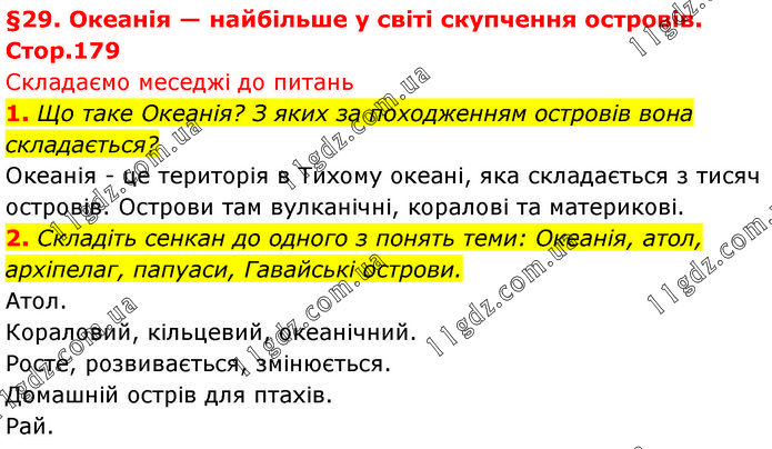 §29. Океанія — найбільше у світі скупчення островів. Стор.179 Складаємо меседжі до питань 1. Що таке Океанія? З яких за походженням островів вона складається? Океанія - це територія в Тихому океані, яка складається з тисяч островів. Острови там вулканічні, коралові та материкові. 2. Складіть сенкан до одного з понять теми: Океанія, атол, архіпелаг, папуаси, Гавайські острови. Атол. Кораловий, кільцевий, океанічний. Росте, розвивається, змінюється. Домашній острів для птахів. Рай.