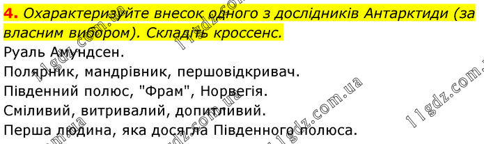 Охарактеризуйте внесок одного з дослідників Антарктиди (за власним вибором). Складіть кроссенс. Руаль Амундсен. Полярник, мандрівник, першовідкривач. Південний полюс, "Фрам", Норвегія. Сміливий, витривалий, допитливий. Перша людина, яка досягла Південного полюса.