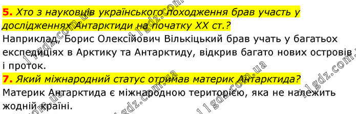 5. Хто з науковців українського походження брав участь у дослідженнях Антарктиди на початку ХХ ст.? Наприклад, Борис Олексійович Вількіцький брав учать у багатьох експедиціях в Арктику та Антарктиду, відкрив багато нових островів і проток. 7. Який міжнародний статус отримав материк Антарктида? Материк Антарктида є міжнародною територією, яка не належить жодній країні.