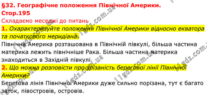 1. Охарактеризуйте положення Північної Америки відносно екватора та початкового меридіана. Північна Америка розташована в Північній півкулі, більша частина материка лежить північніше Рака. Більша частина материка знаходиться в Західній півкулі. 2. Що можна розповісти про зрізаність берегової лінії Північної Америки? Берегова лінія Північної Америки дуже сильно порізана, тут є багато заток, півостровів, островів.