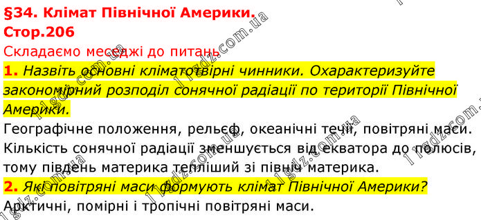 1. Назвіть основні кліматотвірні чинники. Охарактеризуйте закономірний розподіл сонячної радіації по території Північної Америки. Географічне положення, рельєф, океанічні течії, повітряні маси. Кількість сонячної радіації зменшується від екватора до полюсів, тому південь материка тепліший зі північ материка. 2. Які повітряні маси формують клімат Північної Америки? Арктичні, помірні і тропічні повітряні маси.