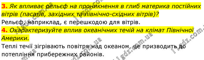 3. Як впливає рельєф на проникнення в глиб материка постійних вітрів (пасатів, західних та північно-східних вітрів)? Рельєф, наприклад, є перешкодою для вітрів. 4. Охарактеризуйте вплив океанічних течій на клімат Північної Америки. Теплі течії зігрівають повітря над океаном, це призводить до потепління прибережних районів.