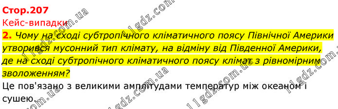 Чому на сході субтропічного кліматичного поясу Північної Америки утворився мусонний тип клімату, на відміну від Південної Америки, де на сході субтропічного кліматичного поясу клімат з рівномірним зволоженням? Це пов'язано з великими амплітудами температур між океаном і сушею.