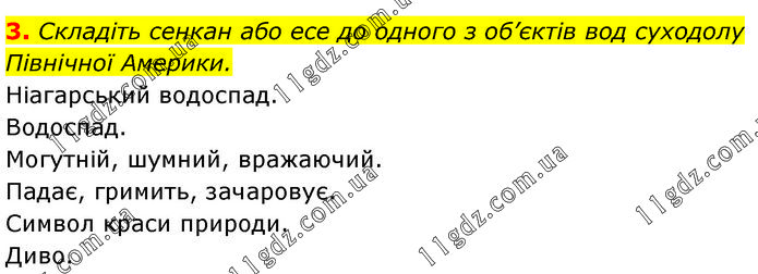 Складіть сенкан або есе до одного з об’єктів вод суходолу Північної Америки. Ніагарський водоспад. Водоспад. Могутній, шумний, вражаючий. Падає, гримить, зачаровує. Символ краси природи. Диво.